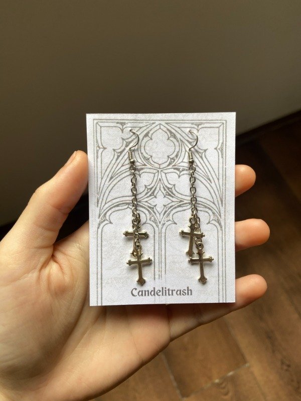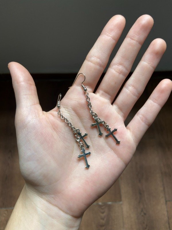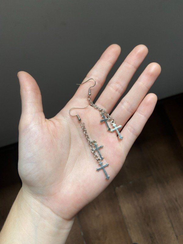 Par de aritos con cadenas y cruces chiquitas en color plateado 🕊️