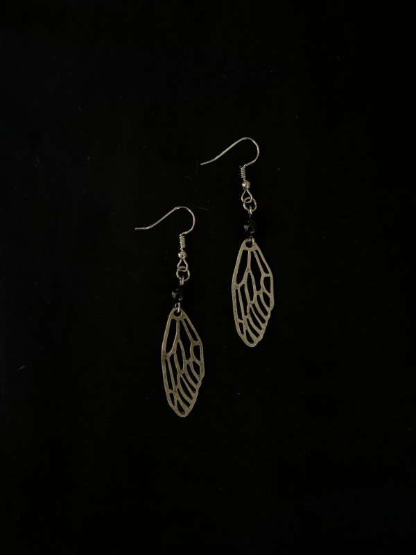 Par de aritos con dijes de alas y bolitas de vidrio.