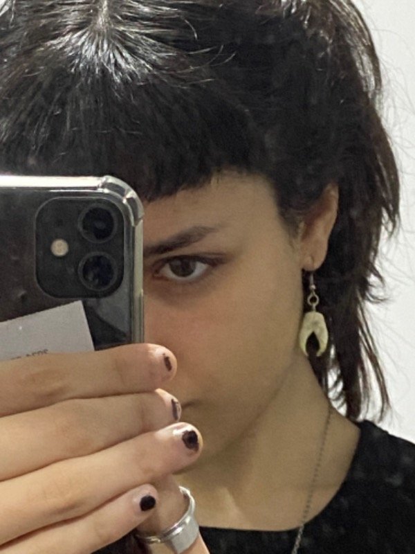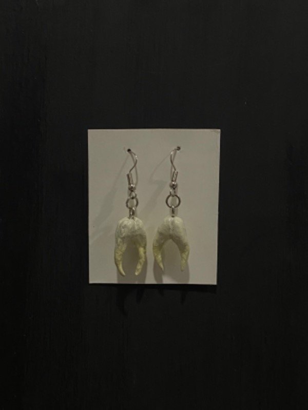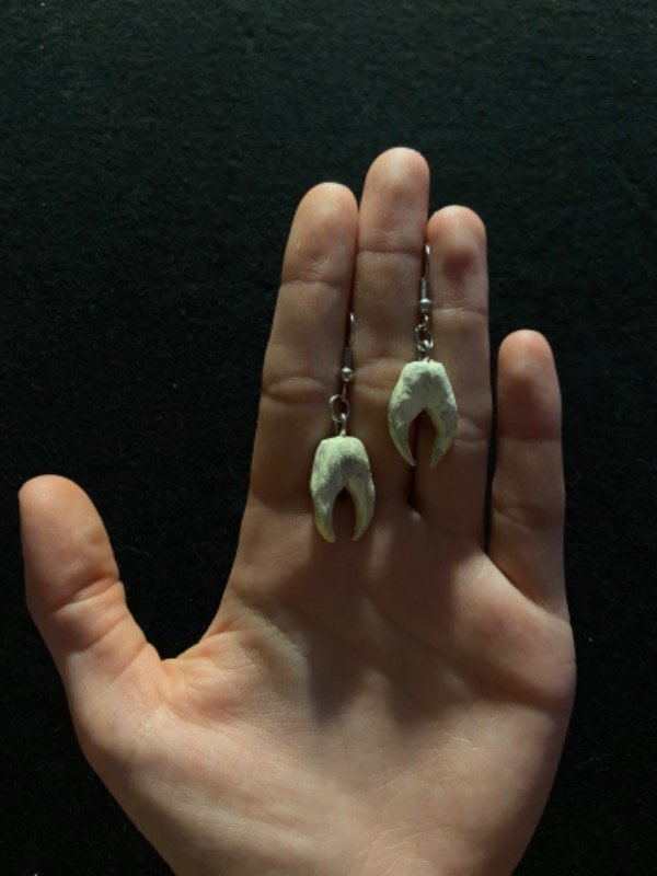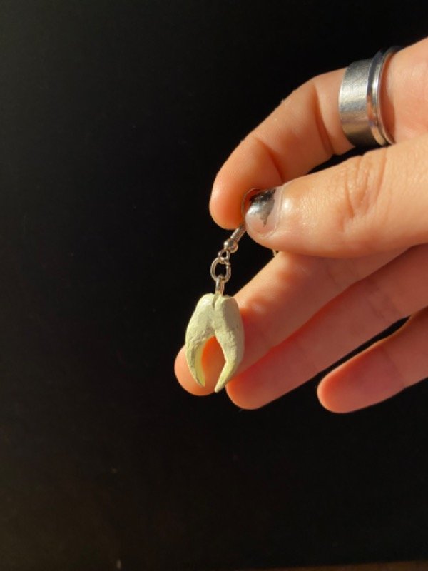 Par de aros con un dije de muelita hecho en arcilla con dos capas de barniz.