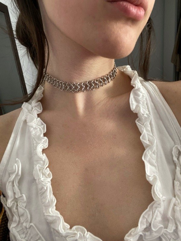 Collar cortito de cadena trenzada. Su largo total es de 38 cm. En caso de quererlo unos cm más largo mandame mensajito por acá con la medida que buscas!