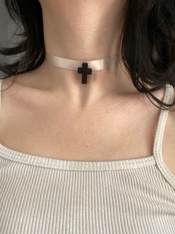 Choker con cinta de raso rosa y una cruz de madera chiquita en el centro. 29 cm de cinta + 5 cm de cadena.