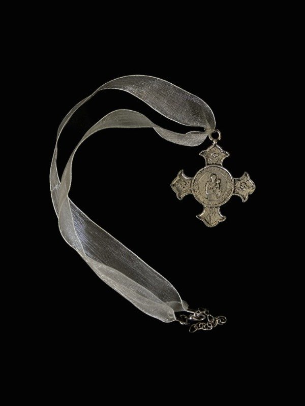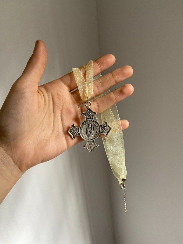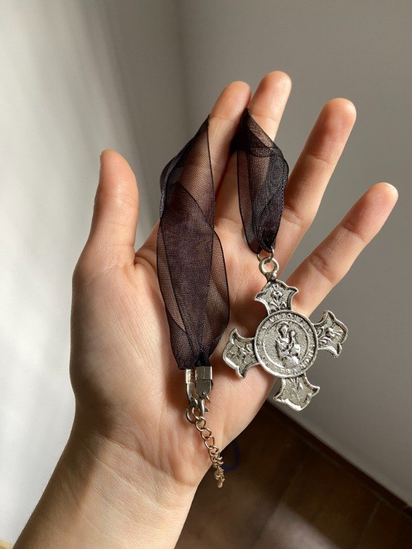 Collar hecho con una tira de organza de 52 cm y un dije pesadito de cruz.
