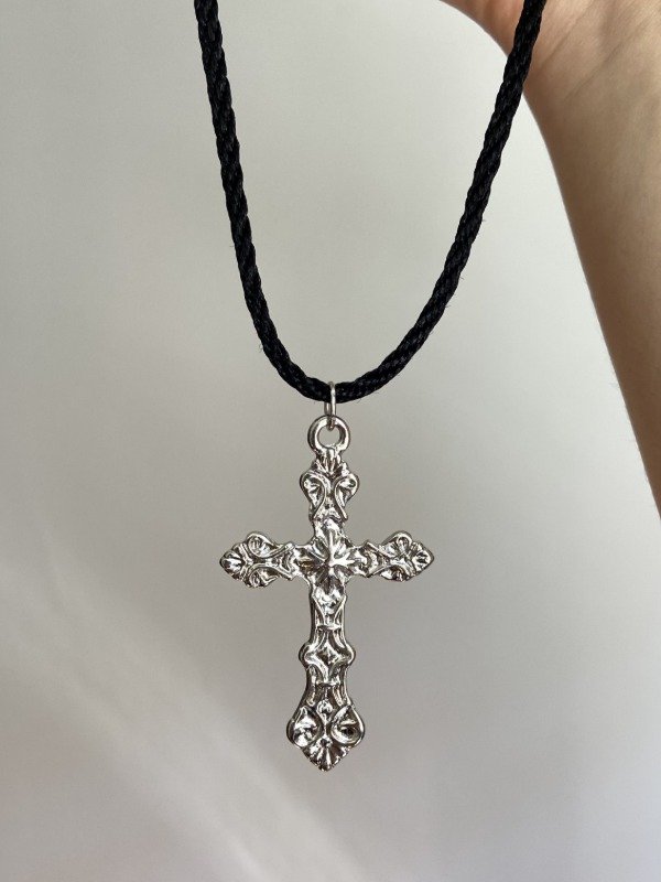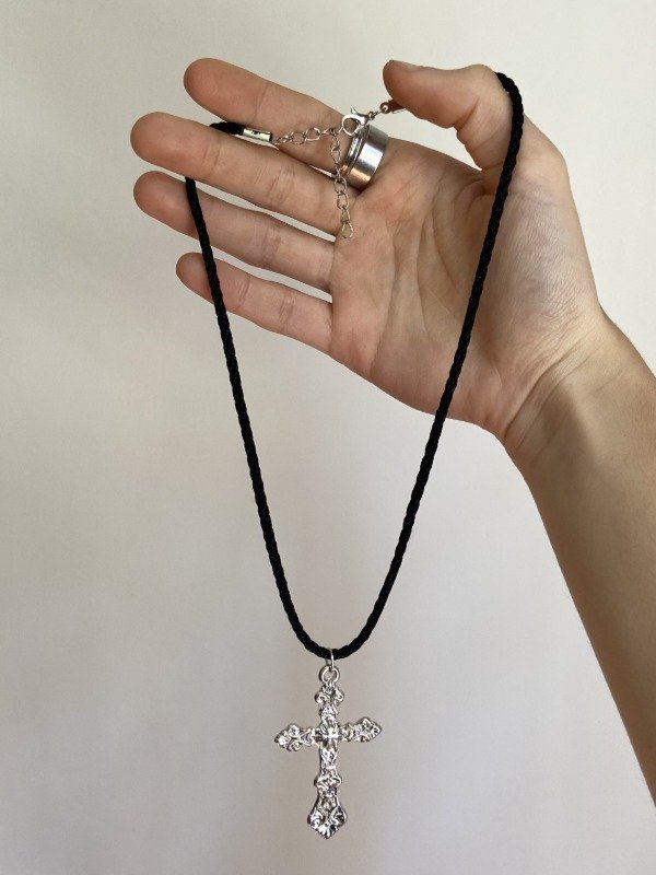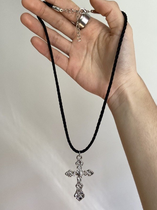 Collar de cordón brillante trenzado con un dije de cruz grade.