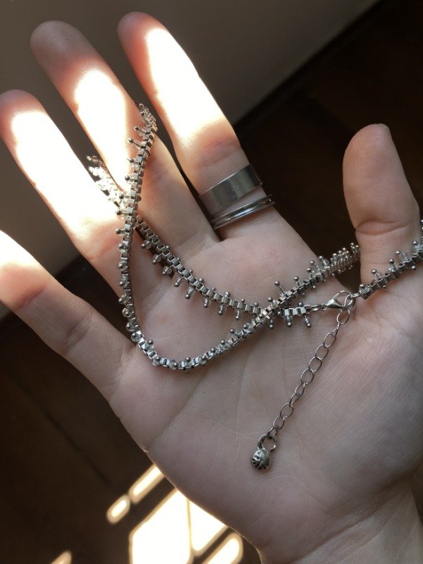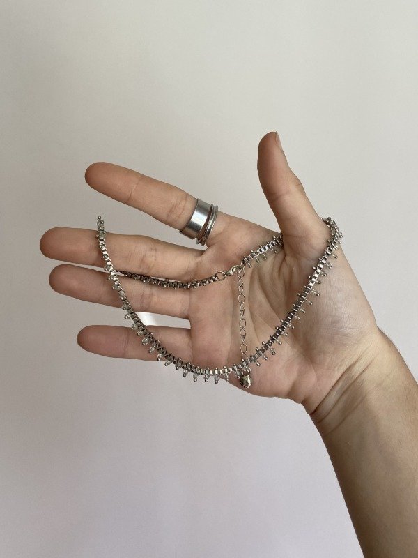 Gargantilla con mini mostacillas enganchadas a lo largo de la cadena, su largo es de 40cm. En caso de quererlo un poco mas largo mandame mensajito por acá con la medida que buscas!
