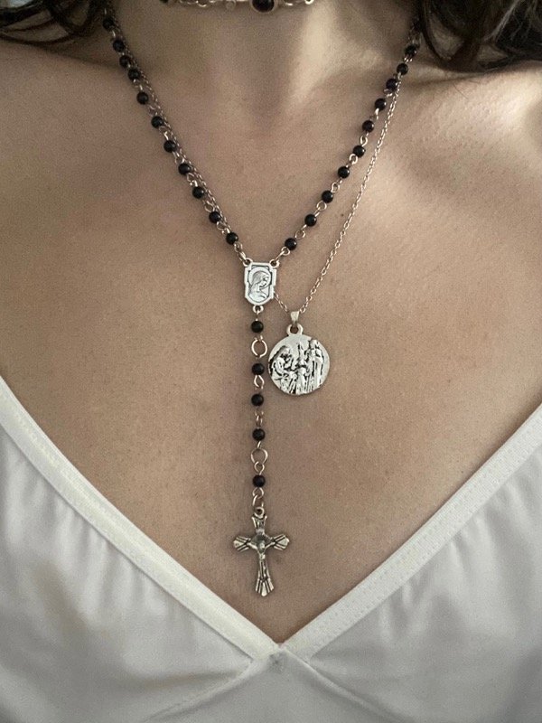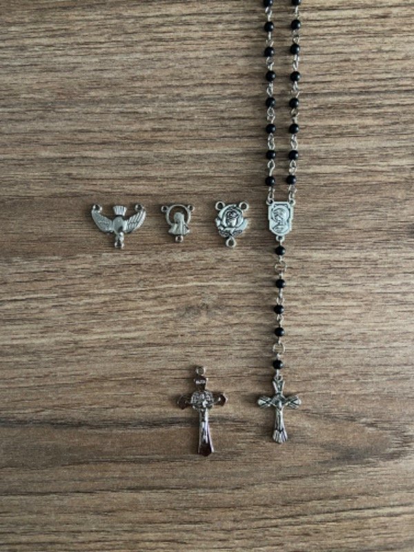 Se me agotaron los centro de rosario cuadraditos y las cruces que uso para hacer estos rosarios, pero si querés uno podes elegir entre esos 3 centros que estan en la última foto y la cruz que tengo de tamaño parecido! Podes confirmarme cual te gusta mandando un mensajito por acá que diga si querés flor, paloma o virgen 🏹
