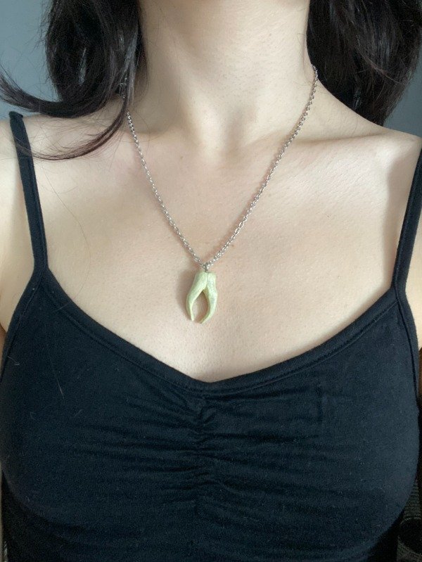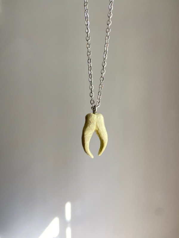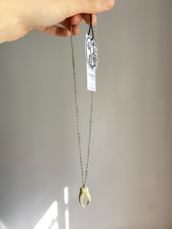 Cadena de acero con un dije de dientito hecho en arcilla.