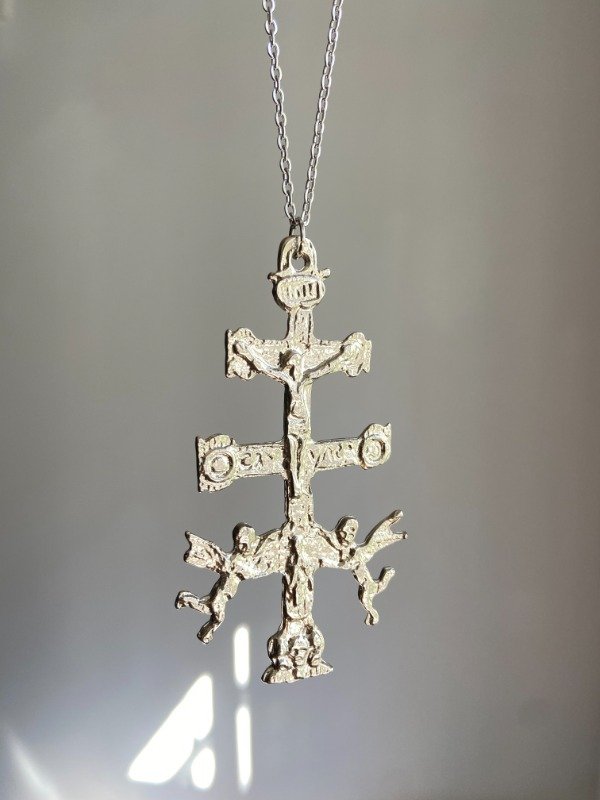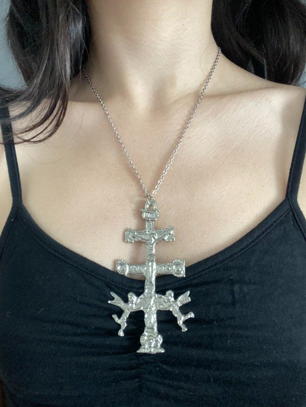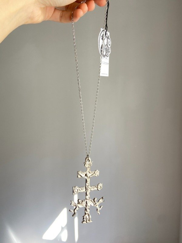 Cadena de acero con un dije grande de la cruz de Caravaca en níquel.