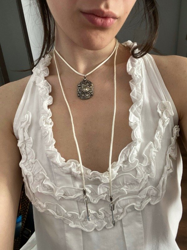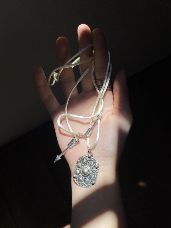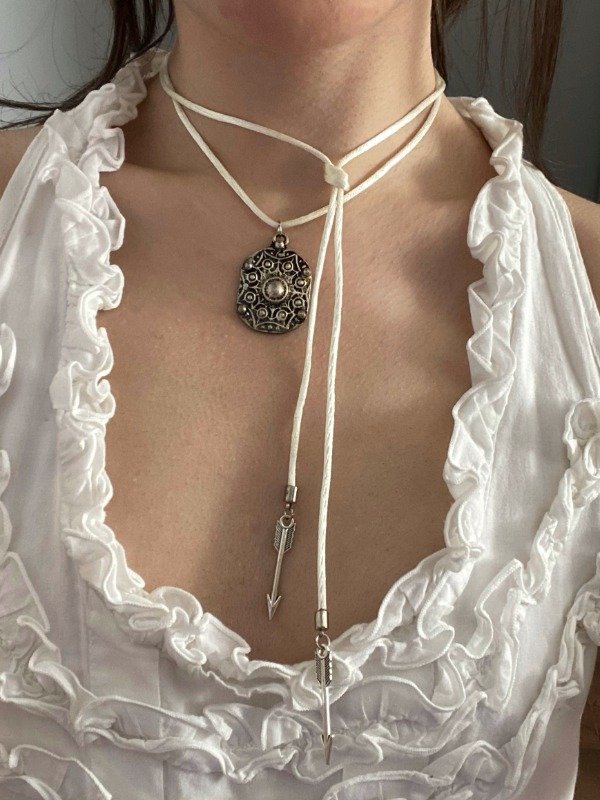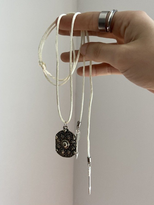 Un metro de cordón de seda con un dije pesadito en el centro. A los extremos unos dijes de flechas🏹
