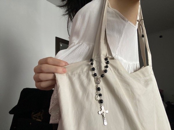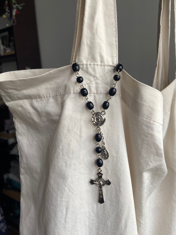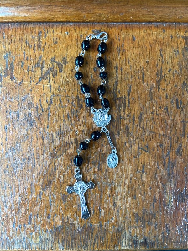 Denario con perlas de vidrio negras